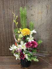 いつもとは違った花材や資材を使った華やかなアレンジメントを作成し、参加者様と賑やかな時間を過ごすことができました。